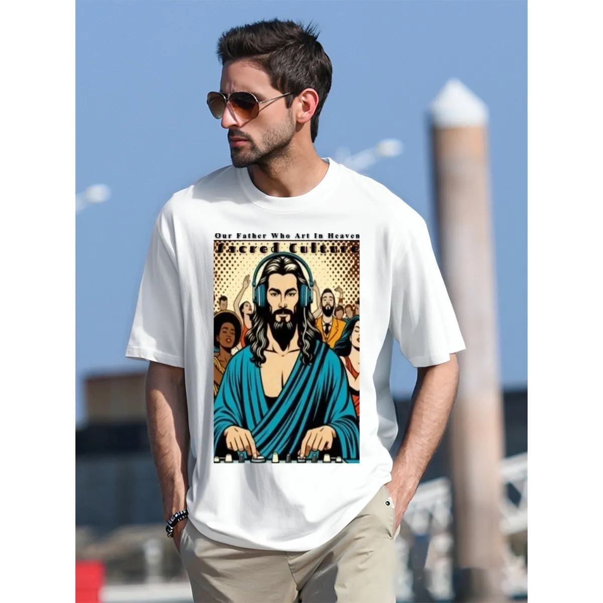 White Unisex Jesus Music DJ Our Father Who Art In Heaven Pop Art Short Sleeve O -neck T-shirt